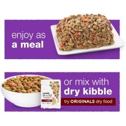 - Packaged in reclosable Beneful dog food tubs, these adult dog food varieties are convenient to serve as a standalone meal or mixed with kibble as wet dog food toppers.