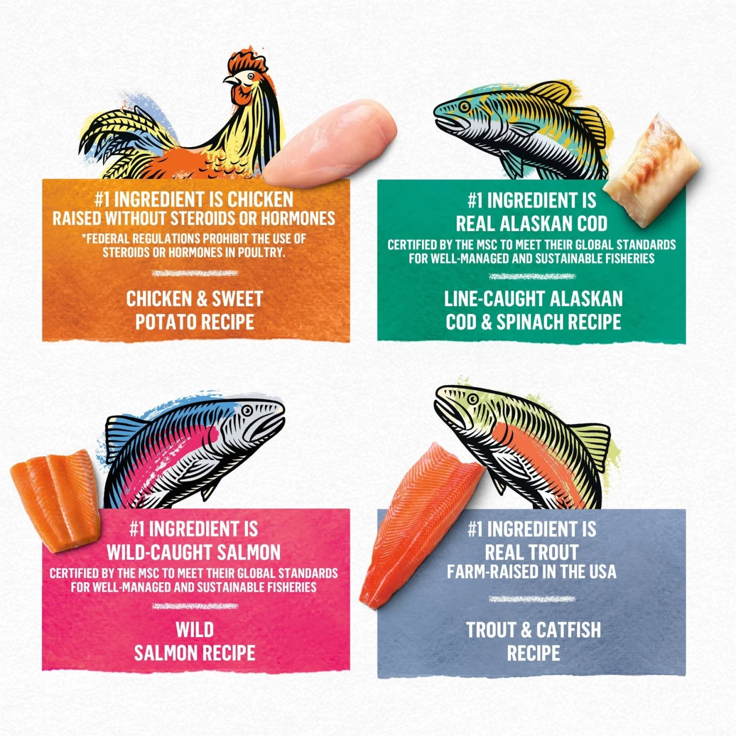 - Features real chicken, Alaskan cod, trout, catfish or wild salmon as the first ingredient.
