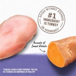 - Real turkey raised without steroids or hormones is the first ingredient in this turkey and sweet potato food.