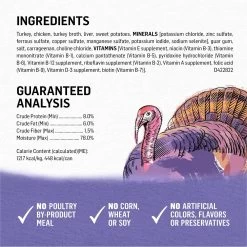 - Free of poultry by-product meal or artificial colors, flavors or preservatives.