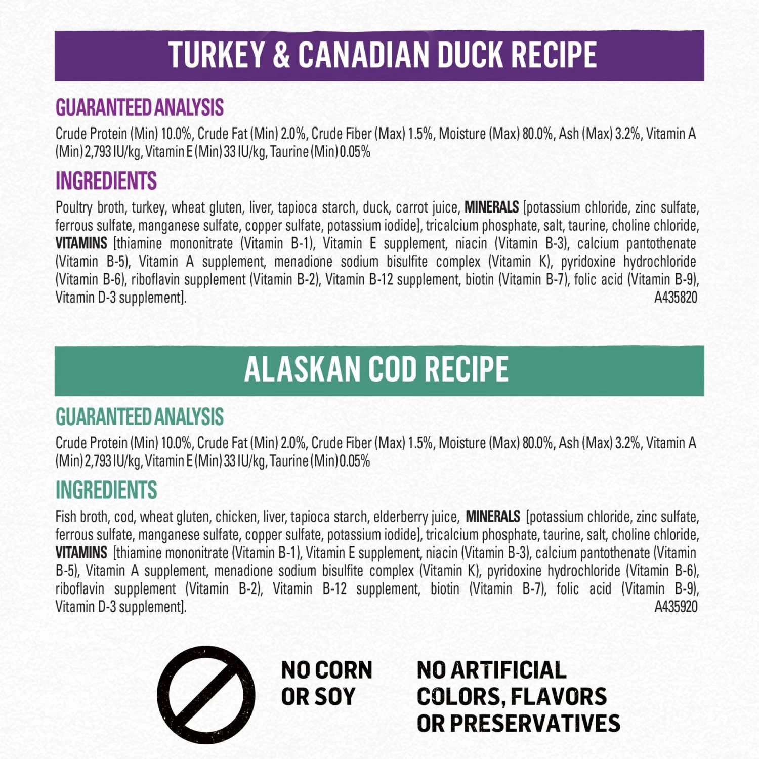 - Four pouches of Line-Caught Alaskan Cod recipe and four pouches of Turkey & Canadian Duck recipe are inside each Mixers+ wet cat food variety pack.
