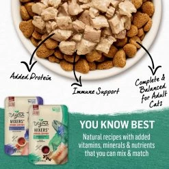 - With extra support for kitty’s immune system, these wholesome, adult cat food toppers are great for mixing with regular dry kibble to boost her daily nutrition.