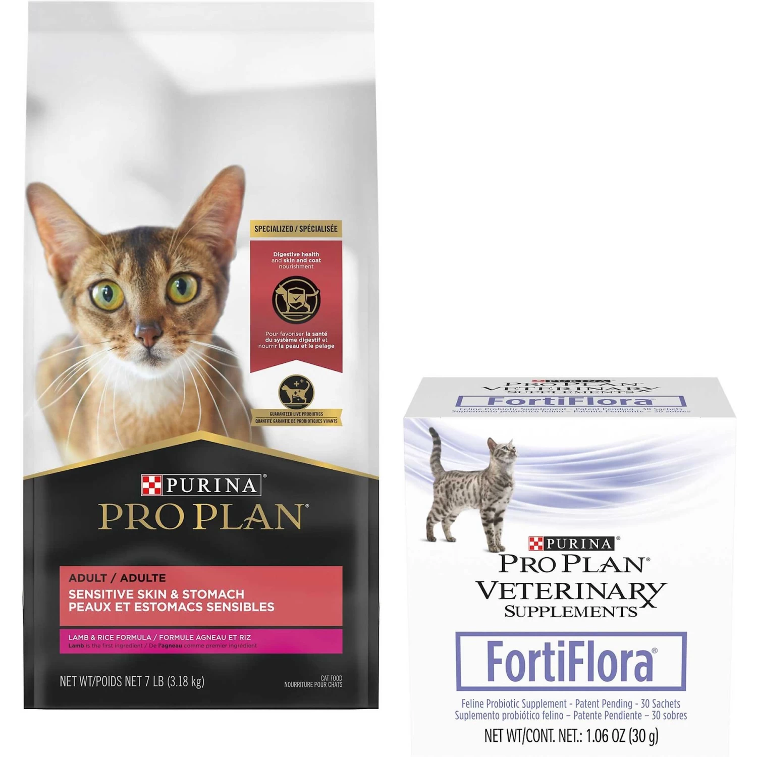 Purina Pro Plan Adult Sensitive Skin & Stomach Lamb & Rice Formula Dry Cat Food & Purina Pro Plan Veterinary Diets FortiFlora Powder Digestive Supplement For Cats