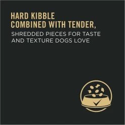 - Hard kibble combined with tender, shredded pieces for taste and texture dogs love