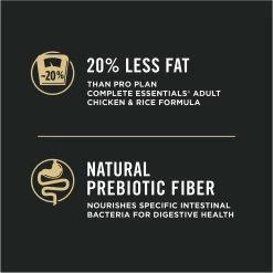 - 20 percent less fat than Pro Plan COMPLETE ESSENTIALS Adult Chicken and Rice Formula