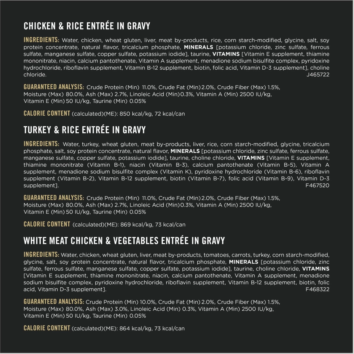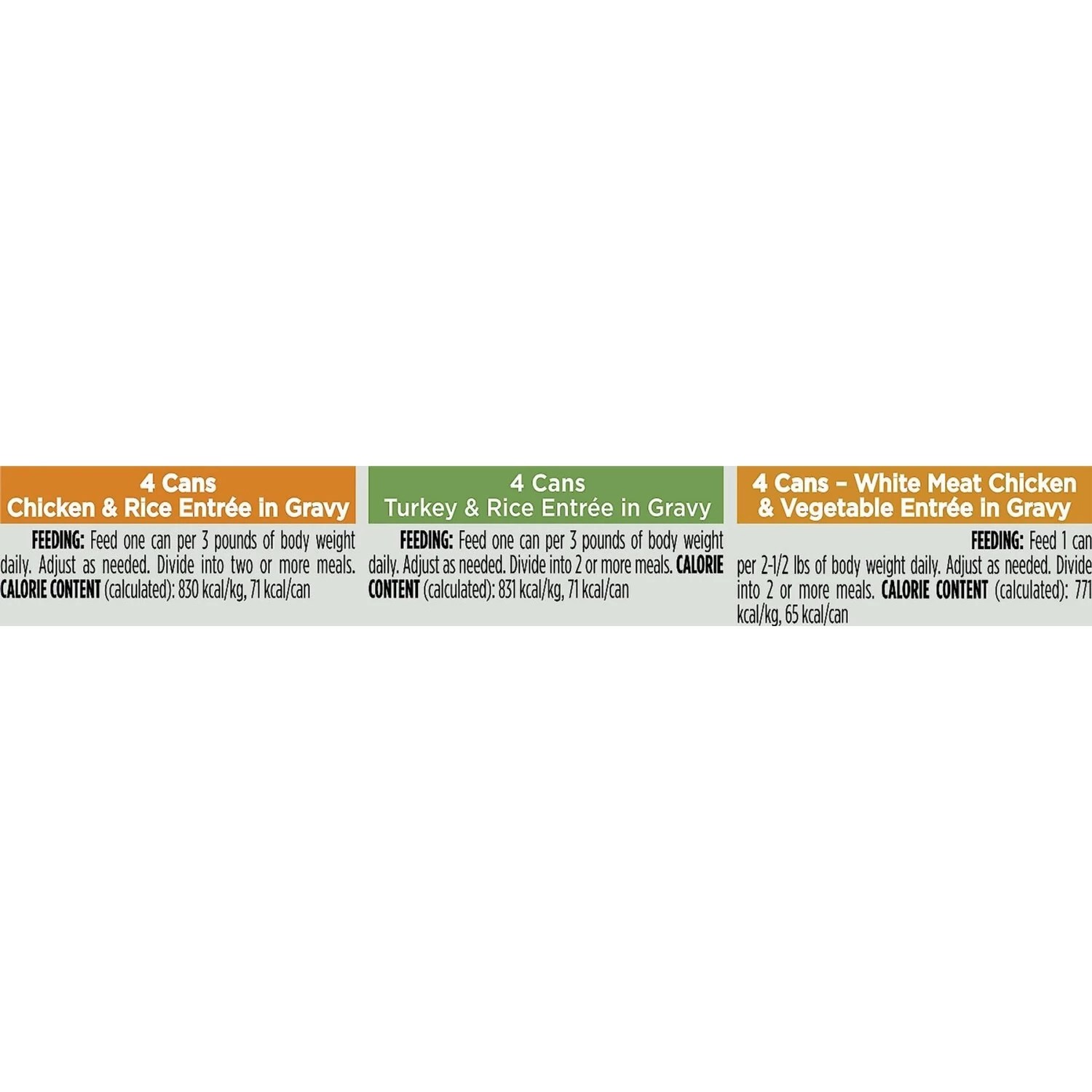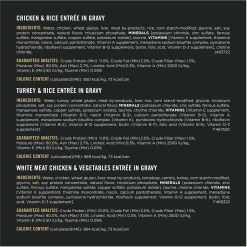 - This variety pack comes with three delectable recipes—Chicken and Rice Entree, Turkey and Rice Entree and White Meat Chicken and Vegetables Entree.