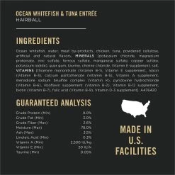 - This hairball control cat food is made with real salmon, whitefish and tuna, or chicken and is loaded with the great taste cats love.