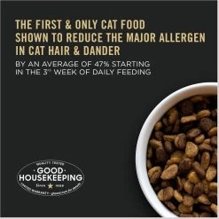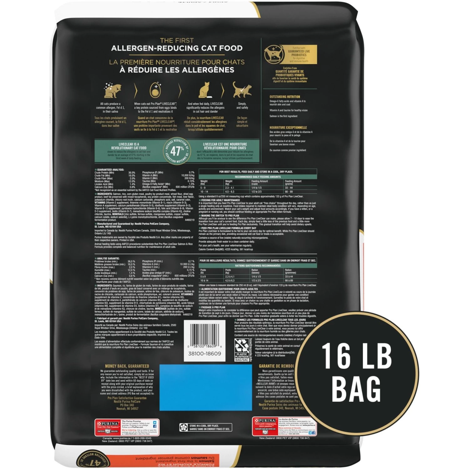 - Discovered through over a decade of research, Pro Plan LIVECLEAR cat food significantly reduces the major allergen in cat hair and dander by an average of 47 percent starting in the third week of daily feeding.