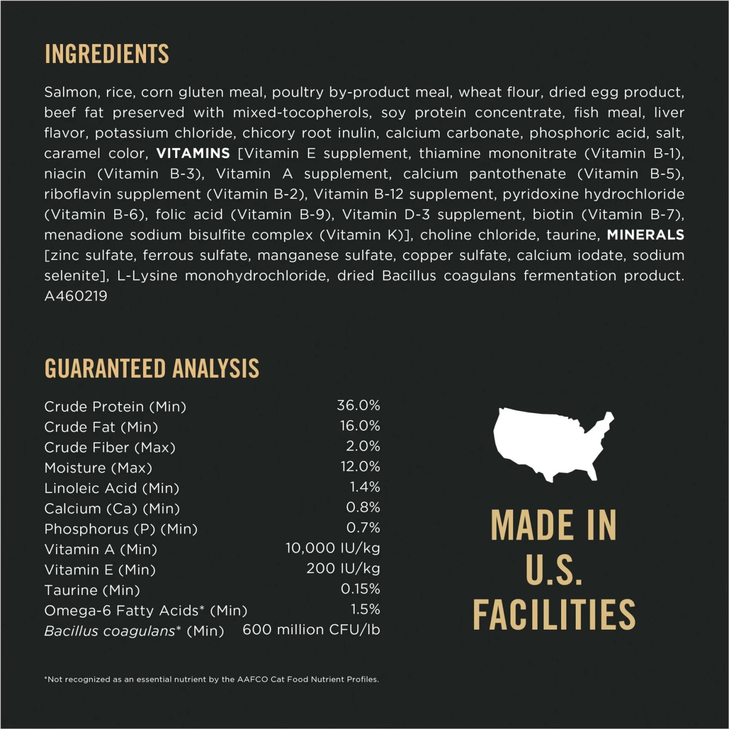 - Salmon is the first ingredient in this yummy and wholesome high protein dry cat food for skin and coat care.