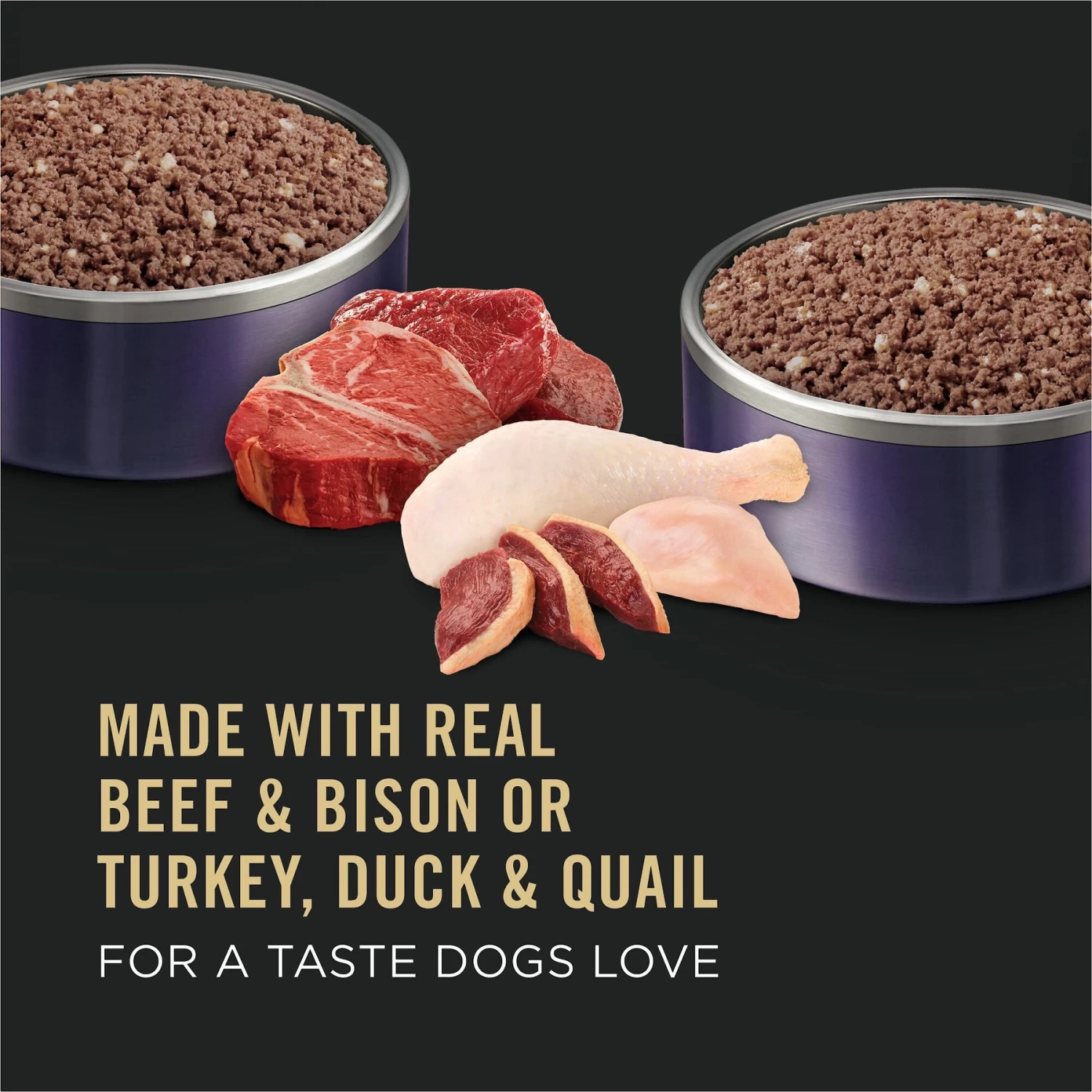 - High-quality wet dog food variety pack has Beef & Bison and Turkey, Duck & Quail formulas.
