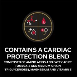 - Contains a Cardiac Protection Blend composed of amino acids and fatty acids (omega-3 and medium-chain triglycerides), minerals and vitamin E.