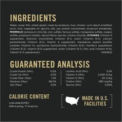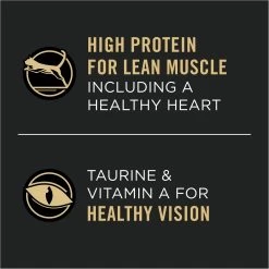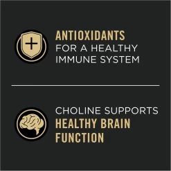 - Features vitamin E and linoleic acid for immune health, protein for muscle health, choline for brain health and taurine and vitamin A for vision health.